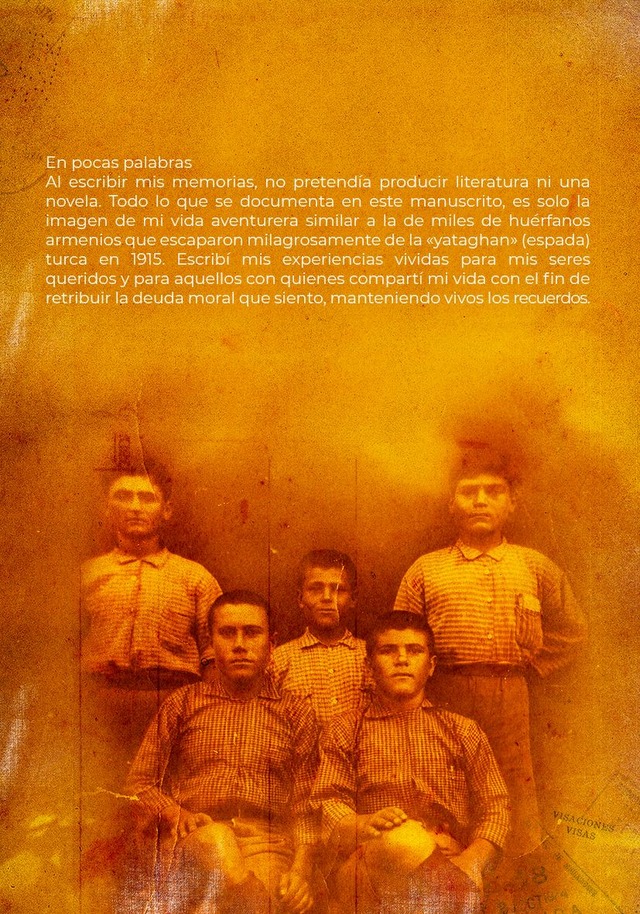 "Todo lo que se documenta en este manuscrito, es solo la imagen de mi vida aventurera similar a la de miles de huérfanos armenios que escaparon milagrosamente de la «yataghan» (espada) turca en 1915. Escribí mis experiencias vividas para mis seres queridos y para aquellos con quienes compartí mi vida con el fin de retribuir la deuda moral que siento, manteniendo vivos los recuerdos."